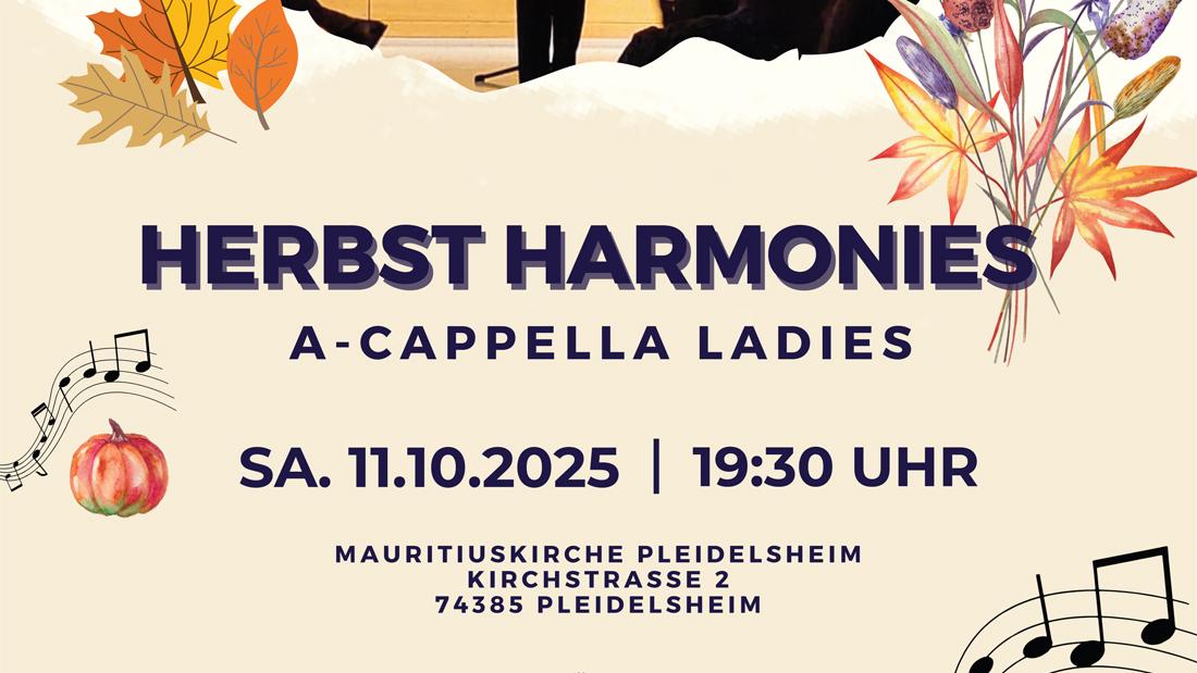 Der Kulturring Pleidelsheim e. V. und die A-Cappella Ladies laden Sie herzlich ein zu unserem diesjährigen Herbstkonzert „HerbstHarmonies” in der wunderschönen Mauritiuskirche in Pleidelsheim - ein Ort, der Atmosphäre und Klang harmonisch verbindet. Die Ladies hatten bereits 2019 die Gelegenheit, ein Konzert in der Mauritiuskirche zu geben, Wir erinnern uns sehr gern daran, wie begeistert unser Publikum damals war. Jetzt kommen wir wieder!
